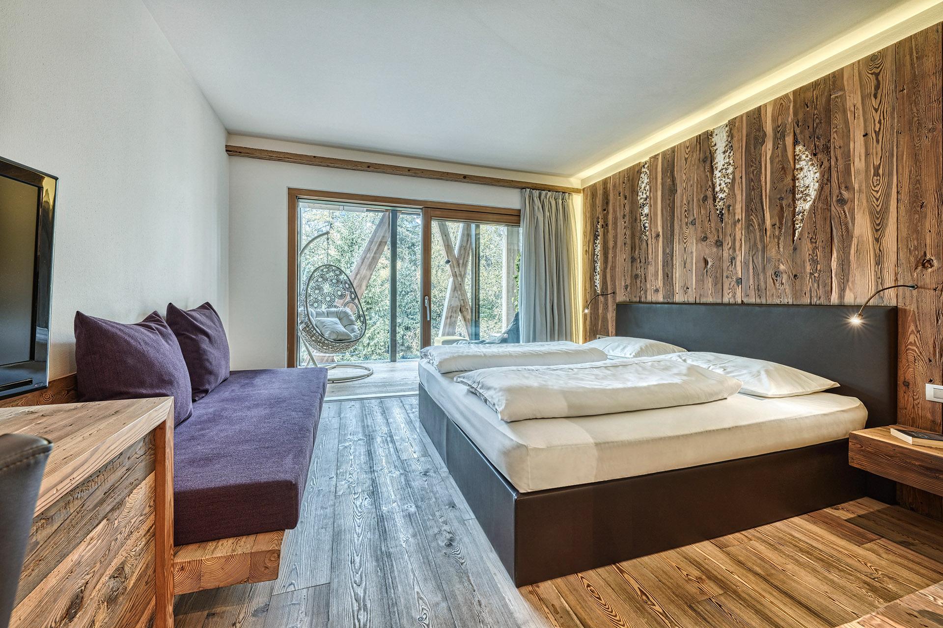 Ein Zimmer, geradlinig und frisch mit naturbelassenen Lärchenbrettern und Eichenboden. Hier treffen traditionelle Materialien wie Holz auf modernes Design. Ein paar Kräuter aus den Südtiroler Bergen sind immer noch an der Lehmwand zu finden. Vor allem der Blick vom Balkon oder dem Wintergarten ist ein richtiges Highlight.