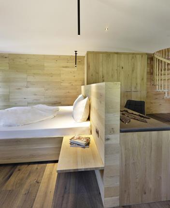 Ein echter Familienhit. Naturholzzimmer auf zwei Etagen in Eiche und Zirbe mit Balkon im zweiten Stock. Dank der Größe und räumlichen Trennung vor allem bei Familien beliebt. Die Eltern genießen den ersten Stock, die Kinder steigen die Wendeltreppe hoch und haben dort ihr eigenes Reich mit eigenem TV.