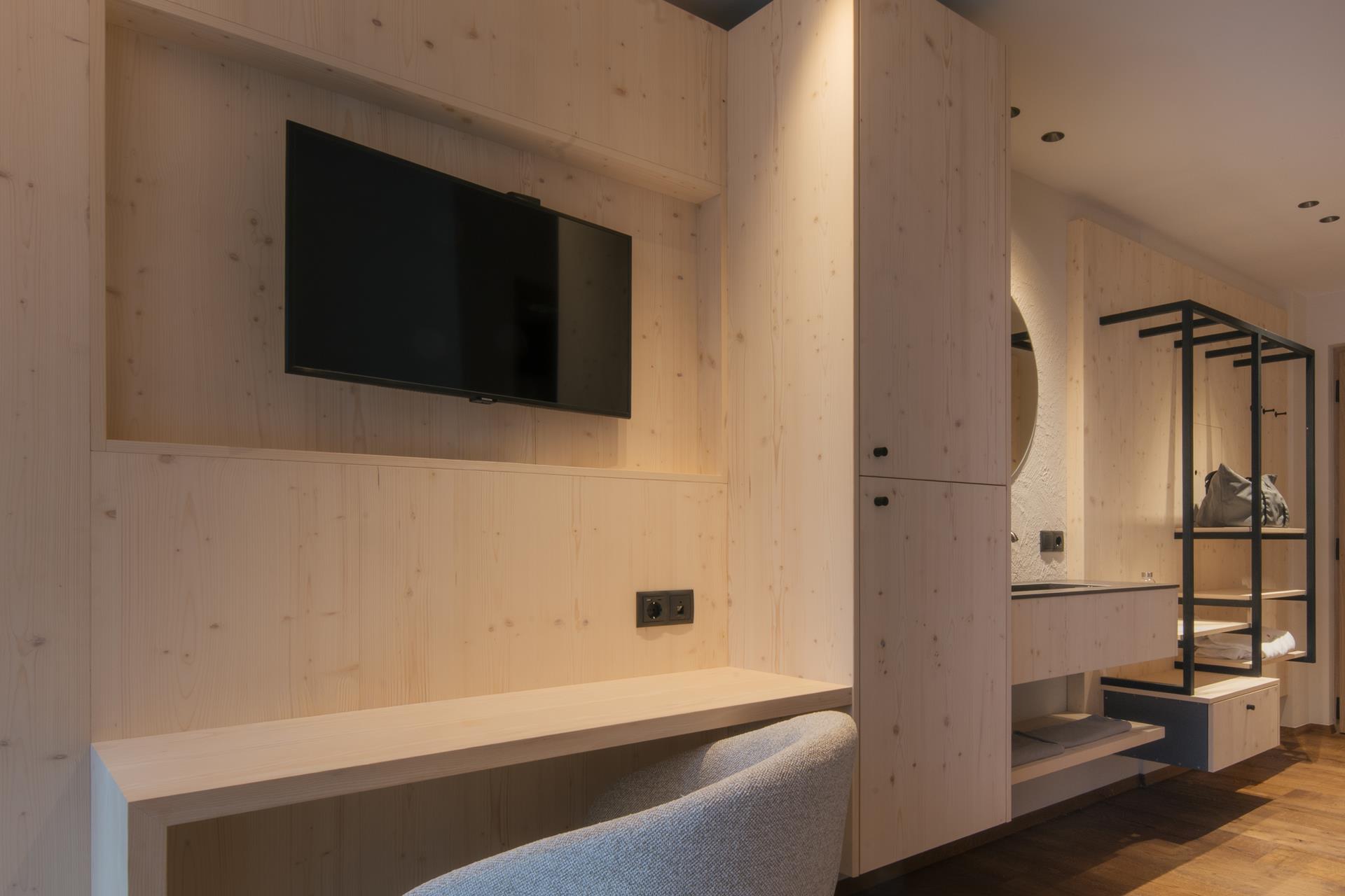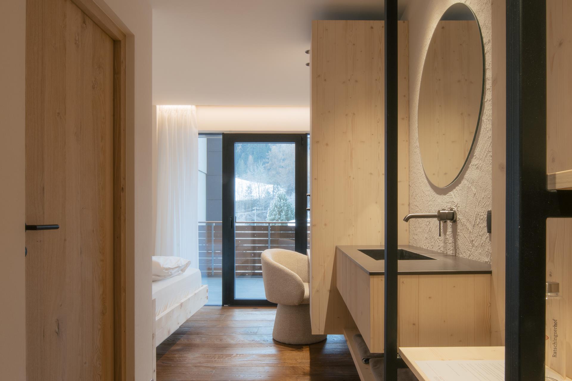 NEW! Our cozy Minisuite Arx impresses with the warm charm of local spruce and Swiss pine wood. The elegant French bed (1.50 m wide) ensures a restful sleep, while the harmonious combination of natural woods creates a particularly soothing and relaxing atmosphere – perfect for couples or solo travelers who want a little extra space. (A surcharge of €40 per night applies when booked as a single room.)