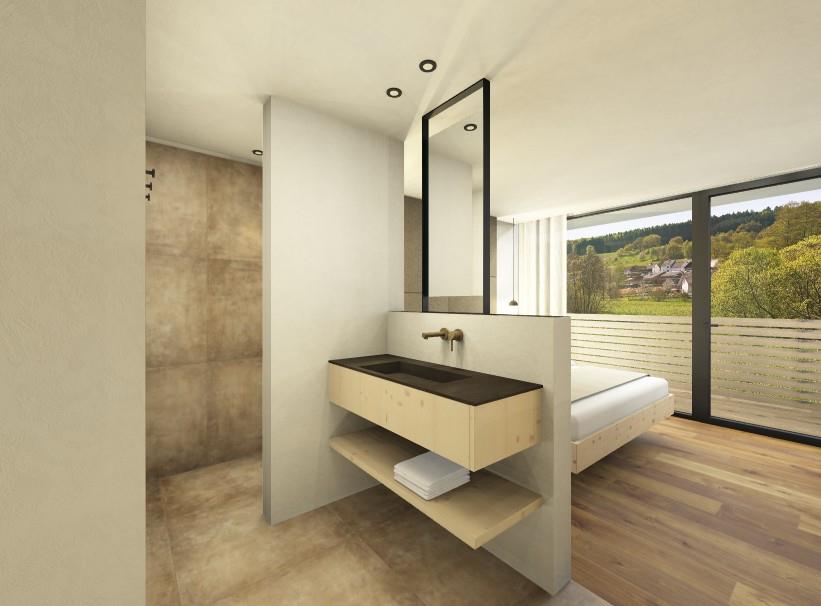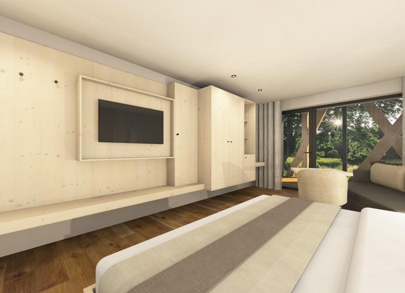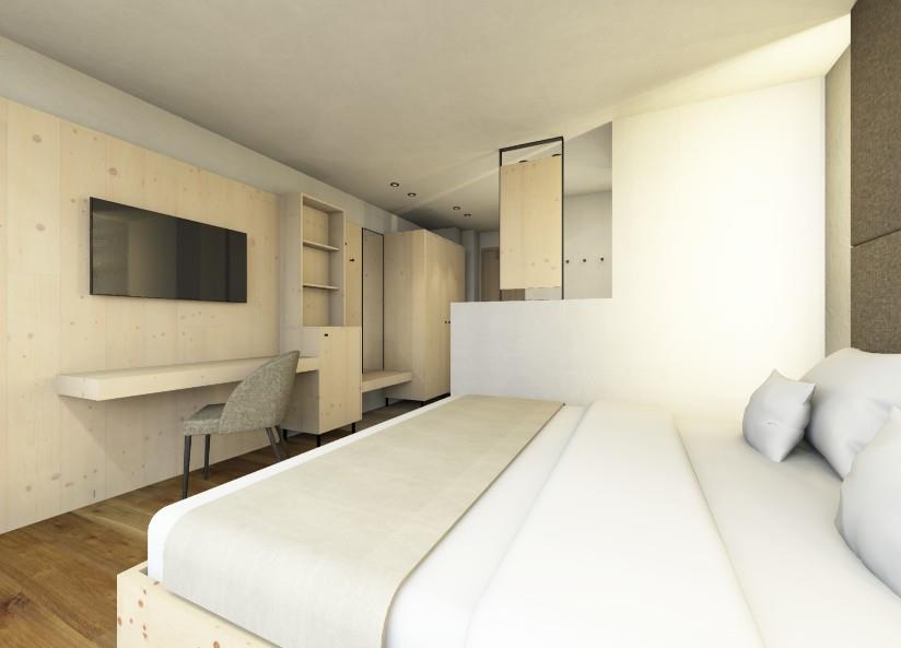 Atmosfera di vacanza in assoluto comfort: camera in legno naturale di abete e cirmolo con pavimento in rovere naturale. Inoltre, balcone o giardino d’inverno al primo o secondo piano. Benessere puro!