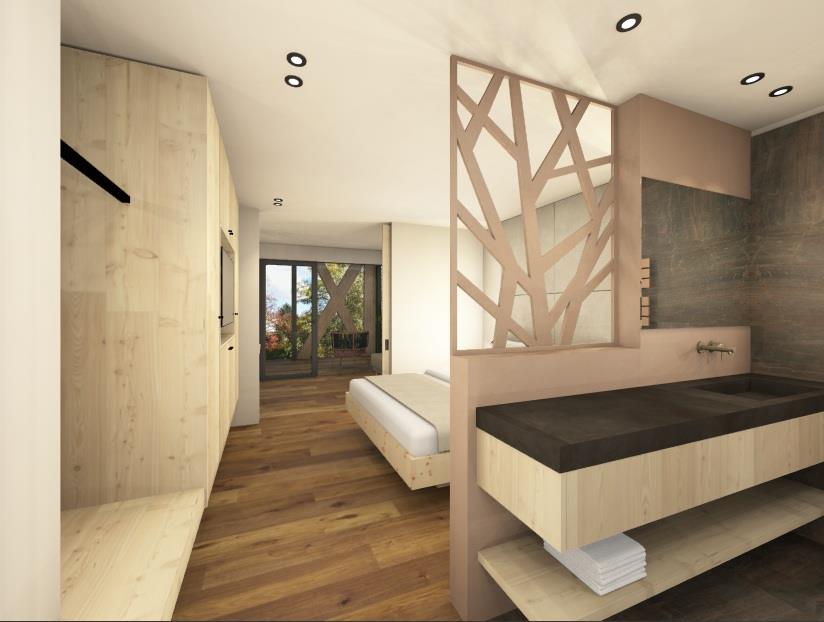 Zona notta e giorno separabili, doccia, WC con funzione bidet, asciugacapelli, telefono, TV satellitare, connessione Internet, frigobar, cassaforte e pavimento in rovere.