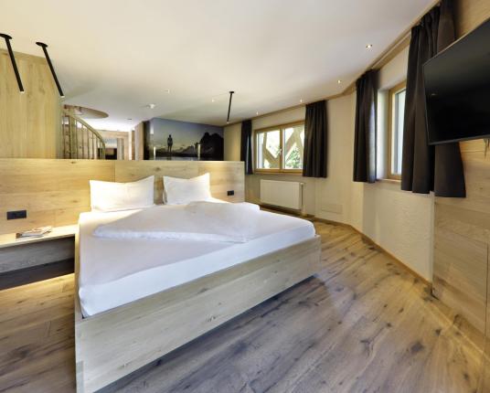 Le vetrate panoramiche portano il sole in camera fino al tramonto. Le nostre Lifestyle suite al primo piano sono moderne e lineari in rovere naturale ed elementi in pelle. Inoltre, sono particolarmente luminose e spiccano per un bagno immenso.